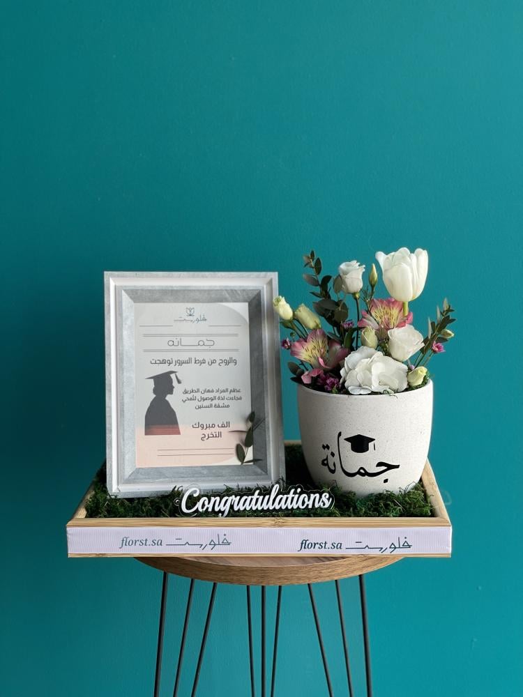 لأن الفرحة تستحق التوثيق، بكج تخرج أنيق يحتوي على شهادة تهنئة بإطار فخم وتنسيق ورد ناعم في فازة تحمل اسم الخريجة. مثالي لتقديمه كهدية تعبّر عن فخرك بها وتبقى ذكرى مميزة للأبد.