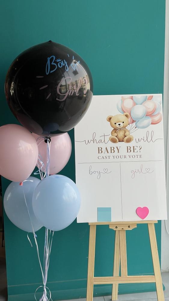 احتفِل بلحظة الكشف عن جنس الجنين بطريقة مميزة ولا تُنسى مع هذا اللوح الجميل المصمم بتفاصيل أنيقة وبالونات جذابة، مثالي لتوثيق توقعات العائلة والأصدقاء.